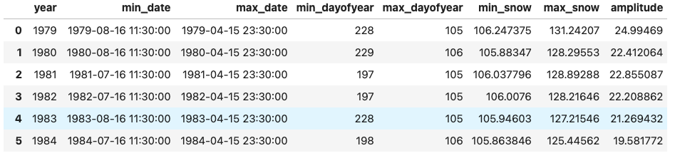 range).When iterating over the years, we want to first pick the designated year, then find the days with the most and least snow as well as the amount of snow on those days.